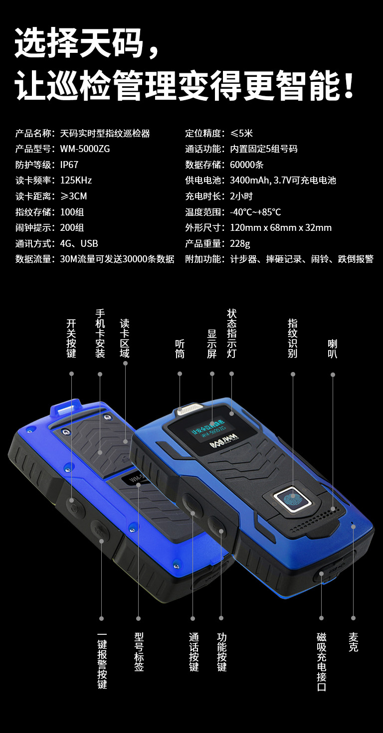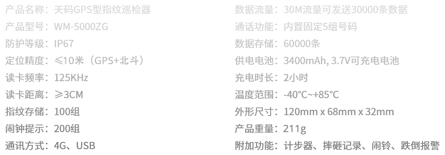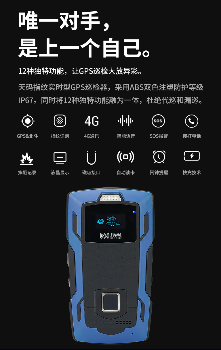天码指纹实时型GPS巡检器,采用ABS双色注塑防护等级IP67。同时将12种独特功能融为一体,杜绝代巡和漏巡。