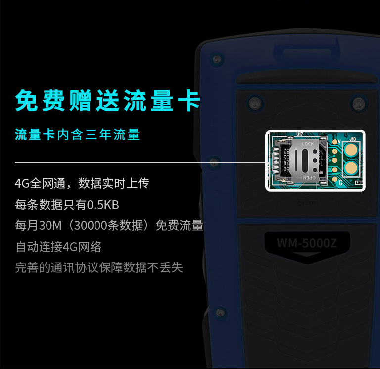 4G全网通,数据实时上传每条数据只有0.5KB每月30M(30000条数据)免费流量自动连接4G网络完善的通讯协议保障数据不丢失