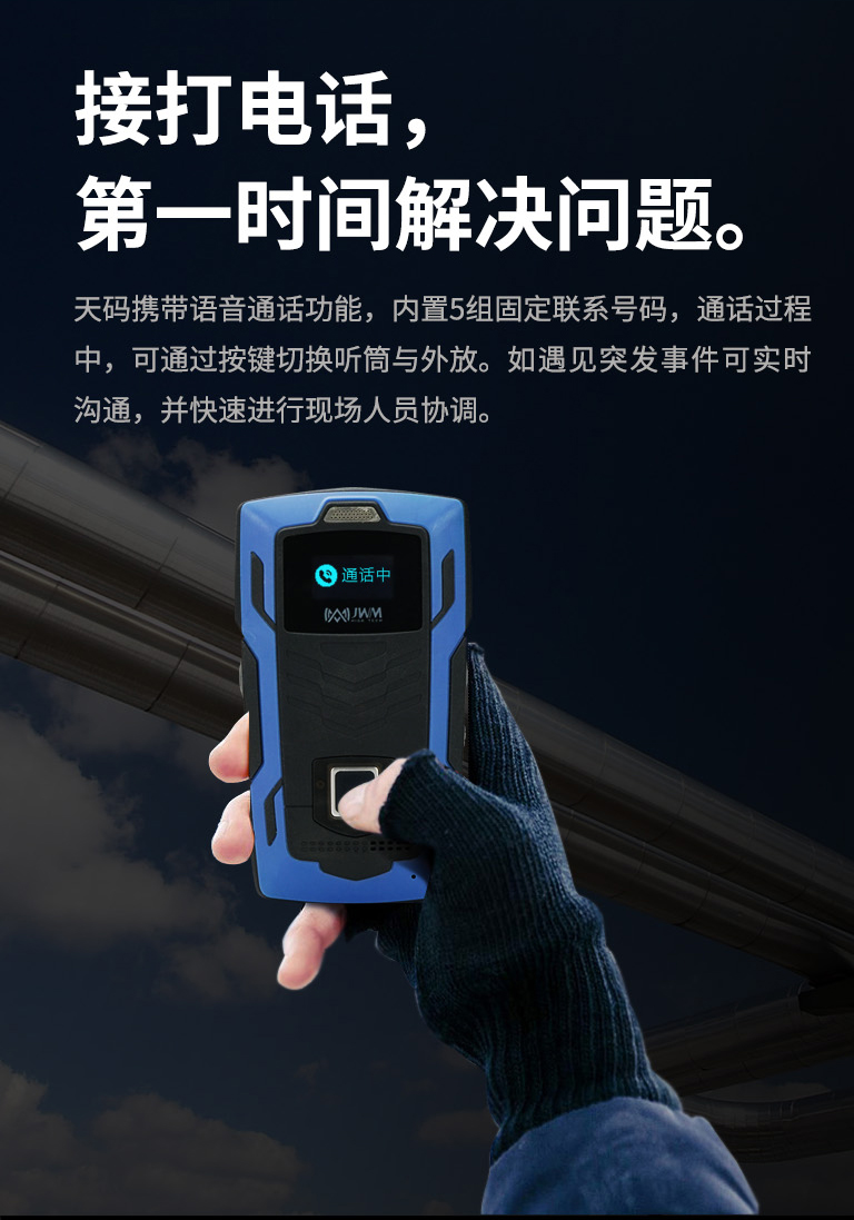 天码携带语音通话功能,内存5组固定联系号码,通话过程中,可通过按键切换听筒与外放。如遇见突发事件可实时沟通,并快速进行现场人员协调。